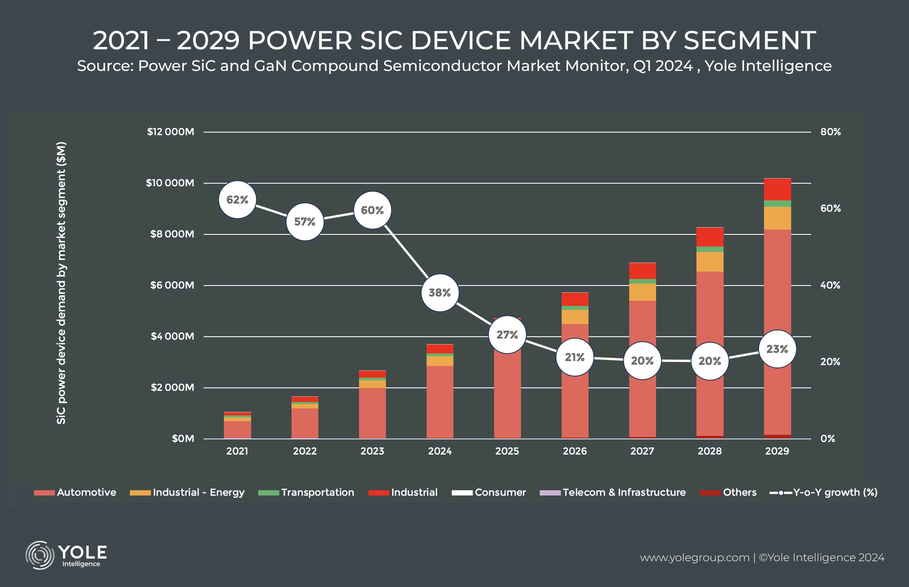 Yole Group, a market research firm specialized in semiconductors, predicts that the total SiC device market will reach a value of $10 billion by 2029. As displayed in the chart below, automotive is expected to be the main driver for near-term SiC growth.