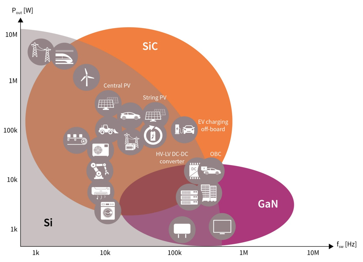 As a result, SiC and GaN power devices have become increasingly popular in applications such as electric vehicles (EVs), EV chargers, solar panels, wind turbines, power adapters, smartphone chargers, and so on. Below is a chart from Infineon showing various emerging use cases for SiC and GaN-based semiconductors, depending on power/voltage requirements (Y-axis) and frequency requirements (X-axis).